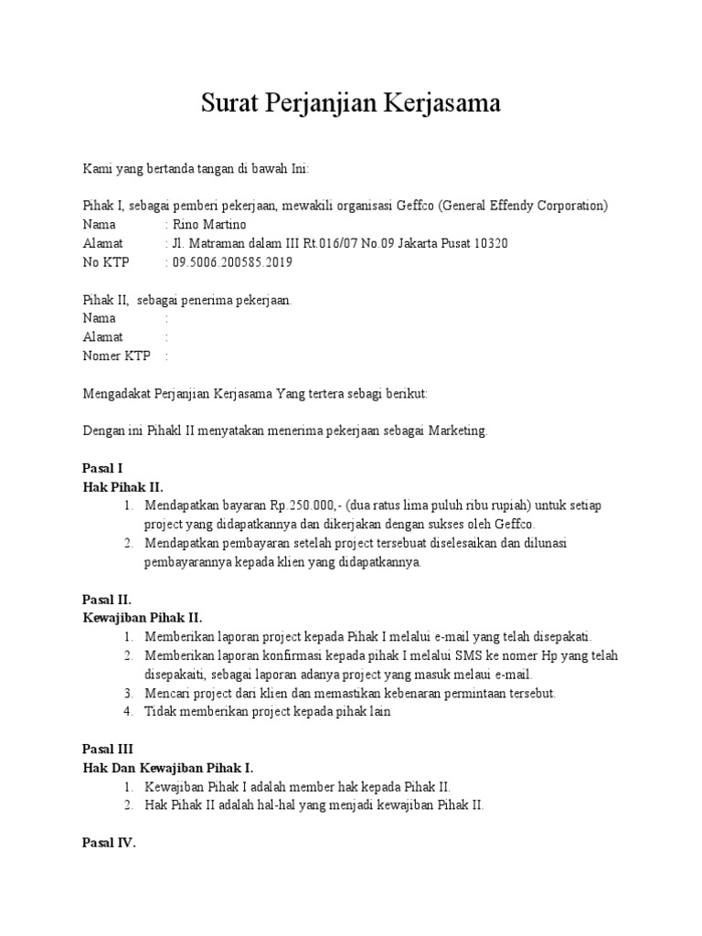 Surat permohonan kerjasama adalah surat yang dibuat oleh suatu perusahaan yang mana tujuannya digunakan untuk menawarkan kerjasama kepada surat ini dalam ruang lingkup bisnis surat permohonan kerjasama ini sangatlah penting. Ini ada contoh surat perjanjian kerjasama atau d isebut juga mou (memorandum. Surat perjan ji an kerjasama. Share & embed surat perjanjian kerjasama investasi. Surat keterangan kerja dari perusahaan. Download surat perjanjian kerjasama investasi. Terkadang perusahaan tidak tahu kapan harus menggunakan surat perjanjian kerja probation, kapan harus menggunakan pkwt, kapan harus menggunakan pkwtt. Sebelum mengetahui bagaimana contoh surat perjanjian kerjasama yang baik dan benar, maka ketahui juga fungsi dan manfaatnya. Contoh surat perjanjian ker jasa ma (mou). Yang bertanda tangan di bawah ini: Pengertian dan penggunaan perjanjian kerjasama. Contoh surat perjanjian kerja surat perjanjian kerja nomer: Pihak i dalam hal ini bertindak sebagai pemilik pt.